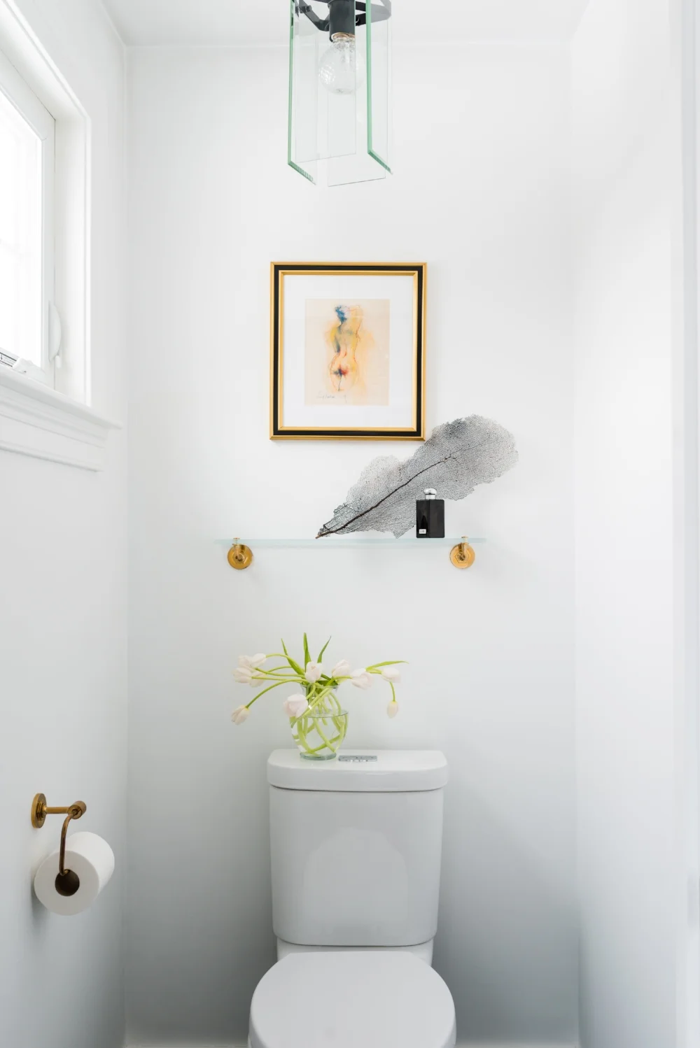 “White walls allow for light to sparkle and bounce off the reflective surfaces throughout the room. The chandelier creates my own little rainbow show at the end of a long day”